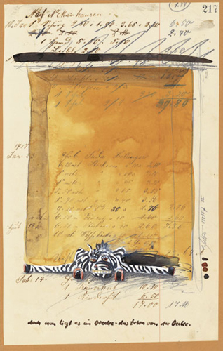 ...doch nun liegt es im Drecke, das Zebra von der Decke. Aquarellierte Bleistiftzeichnung auf antikem Papier