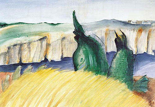 Die Wanderung der Wassernöcken, Aquarell und Acryl mit Dammar und Feder auf Batist auf Papier, 66,5 x 96,5 cm, in Privatbesitz