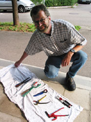 Bernd Salzer Selthaft? Fabelsam? Da hat einer die Sprache verdreht. Hat aus etwas Gewohntem, Geläufigem etwas Fremdes, Befremdliches gemacht. Etwas, das uns aber plötzlich doch eigenartig vertraut vorkommt. Seltsam! Fabelhaft? So kann es uns beim Betrachten der Bilder von Bernd Salzer gehen: Auf den ersten Augenblick meinen wir zu erkennen, was da zu sehen ist, worum es geht. So aufdrängend realistisch springen uns viele Motive entgegen. Doch schnell verwischt oder besser verfremdet sich dieser scheinbar klare Eindruck und macht einer Hintergründigkeit, manchmal fast schaurigen Doppelbödigkeit Platz, die uns nicht kalt läßt. Das kann doch wohl nicht wahr sein, was da alles zu sehen ist! Doch so wenig sich der Betrachter wünscht, diesem fetten Schwein, dem Koloß mit dem Messer, der Hyäne auf den Krücken in seiner Lebenswelt zu begegnen oder dem Pulcinella unter die hohlen Augen zu kommen, so sehr ziehen Bernd Salzers Gemälde den Betrachter in seinen Bann, versetzen ihn in eine ambivalente Spannung, der er sich nur mühsam entziehen kann: die Spannung seiner ästhetischen Auseinandersetzung mit dem Unästhetischen. Wer jetzt eine kantige, kräftige "Charakterfigur” erwartet hat, der begegnet mit Salzer einem schmalen, eher zurückhaltend wirkenden Menschen, klare, eingehend und scharf beobachtende Augen, gerne ein ironisches Lächeln im Mundwinkel, und stets neugierig auf sonderliche Anblicke und Begegnungen am Rande des Geschehens. Ein guter Beobachter ist er schon immer gewesen. Sein bewußtes zeichnerisches Leben beginnt eigentlich mit vier. Schon als Schulkind nutzt er zusätzliche Freiheit in Grippezeiten und zeichnet unermüdlich Steinzeitgestalten, Germanen, Ritterburgen, bringt geschickt Flugzeuge und Panzer aufs Papier, baut und bemalt sich später sogar eine eigene Apollo-Rakete. Aus Pappe, für’s Zimmer. In der Schule bringt er nur in “Bildender Kunst” die besten Noten heim. Er malt gerne und mit Hingabe geografische und historische Motive, Klassenarbeiten und Hausaufgaben illustriert er zuweilen mit treffenden Zeichnungen, wie wenn er sich mit seinen Bildern lieber und besser ausdrücken würde als mit der Sprache. Später illustriert er sich Science Fiction-Romane von Stanislaw Lem, die ihn besonders faszinieren. Wo immer er hinkommt, nimmt der Augenmensch Salzer Bilder, Motive, Formen auf, zeichnet und malt frei aus dem Gedächtnis, bringt Träume und Phantasien in scheinbar realistische Formen. Wenn er eine Begebenheit, eine Landschaft, einen Ort manchmal nach langer Latenzzeit “ausgebrütet” hat und dann ungeduldig ins Bild bringt, kann er oft eine eindrückliche Geschichte dazu erzählen. Aber im Kopf und auf dem Papier hat sich diese schon längst verändert, ist entgleist, seltsam oder genialisch mutiert: Der Seemann Störtebecker etwa findet sich aufrecht aber kopflos vor dem Hintergrund der Kulturstadt Dresden. Ein Harlekin, Salzers persönliche Symbolgestalt, vollzieht seinen verqueren Schulreifetest unter dem geifernden Maul eines teuflischen Säulenheiligen. Gänzlich Unrealistisches zeigen seine Bilder oft, Fiktionales, das auf eine faszinierende Art natürlich, beinahe naturalistisch aussieht. Viele seiner Motive und Details hat er also erfunden, aber keines seiner Bilder ist reine Phantasie, jedes hat vielfältige Bezüge zu Beobachtungen und Erlebnissen des Künstlers. Dabei sind diese monumentalen Fabelwesen nur ein kleiner Aspekt von Salzers künstlerischer Tätigkeit, die malerisch umgesetzten “großen” Phantasien. Er selbst sieht sich eher als Vertreter der kleinen Formen, als einen Zeichner, eng verwandt mit Horst Janssen und in “geistigem Konsens” seinem großen Lehrer Peter Grau verbunden. Und seine Schubladen sind voll von noch unveröffentlichten Skizzen und Werken. Genauso eigentümlich wie seine Themen und Motive ist Salzers Maltechnik. Als Malgrund verwendet er gern Batist, den er mit Knochenleim auf Papier aufzieht. So entgeht er dem “weißen Blatt”, vor dem so viele Künstler einen Heidenrespekt haben. Der gelbliche Untergrund, der dadurch entsteht, enthält mit seinen Unebenheiten und Flecken schon einen Vorschein des Motivs, bietet mit seiner Struktur beinahe etwas wie eine angedeutete “Phantasielandschaft”, in die der Künstler dann seinen ersten Strich setzt und damit den Raum definiert und aufteilt. Meistens beginnt er mit einer Skizze, die die Gesamtkomposition mal genau, mal in den wichtigsten Umrissen festhält. Dann wird aquarelliert: einmal, zweimal, dreimal, bis die Idee von der Wirkung des Bildes und seiner Tönungen, von hell und dunkel, von Schatten und Licht gefunden und festgelegt sind. Und meistens verändert sich die Idee das Ergebnis sowieso im Verlauf der Arbeit. Aus dem zeichnerischen wird ein malerischer Prozess, mit einer eigenen, nie voraussehbaren Dynamik der Farben und Formen. Es entstehen keine ausgedachten, konstruierten Bilder die Werke schälen sich heraus, kommen manchmal geradezu zum Ausbruch. So geschieht es vor allem bei den Bildern, die Salzer frei auf’s Papier bringt. Während etwa der Knochenfisch, die Hündin der Welt oder der Störtebecker im wesentlichen kolorierte Zeichnungen sind, ist der große grobe Elefant, ist der Pulcinella ohne einen Bleistiftstrich in absoluter Freiheit entstanden. Keine Linie, die den Maler binden würde oder an sich festhalten könnte. Es wird also aquarelliert aber wie wird aquarelliert! Salzer geht an seine Aquarelle wie wenn er in Öl malen würde: kräftige auftragende Farben, beherzte, teilweise raumgreifende Pinselstriche. Und doch erzielt er keineswegs “ölige” Effekte: Mit den lasierenden Möglichkeiten der Aquarellfarbe bewirkt er einerseits realistische Figuren und Räume, dahinter aber eine äußerst faszinierende Durchsichtigkeit: Vor uns steht etwas, unübersehbar, drastisch. Und darin, dahinter schimmert es durch, vieldeutig und spannungsreich. Was wir vorher schon bei vielen seiner Motive charakteristisch fanden, wiederho